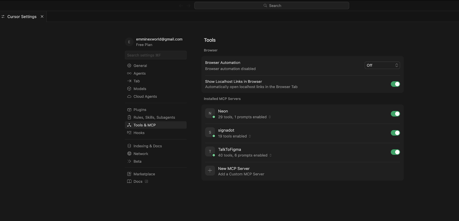 In practice? You open Cursor. Its Agent scans your enabled MCP servers, loads the tools they expose, and figures out which ones to call as part of whatever task it's working on. Head over to Cursor Settings > Tools & MCP and you'll see every loaded server with a status indicator. You can flip individual tools on or off from that panel.